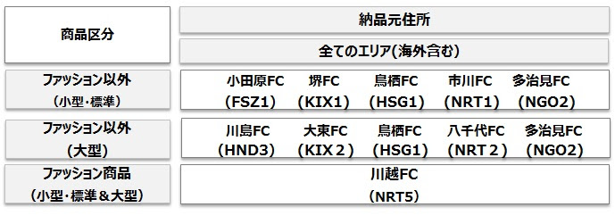 納品元住所の最寄りのFCが納品先として指定されておりますが、 2015年6月1日より、 購入者の需要分布と各FCの在庫のバランスにより最適な納品先F Cが指定されるようになります。小型・大型サイズの商品は、 納品先FCが毎回変わりますのでご注意ください。