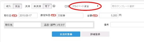 「プライベート資金」を選択して日付入れて、交際費、5000円、と。