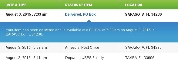 「6:28am Arrived at Post Office」からの「7:33am Deliverd, PO Box」。